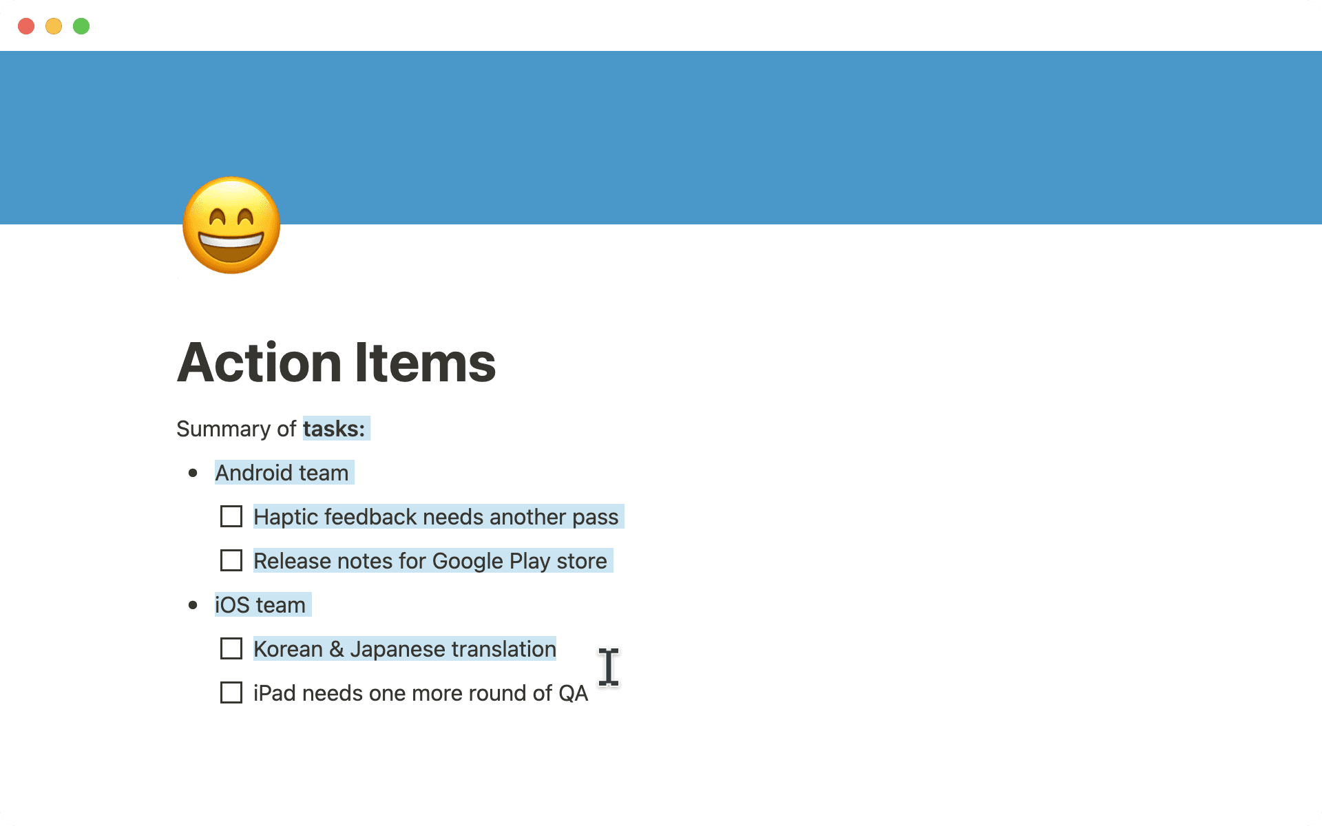 • 데스크톱: 텍스트, 글머리 기호 목록, 콜아웃 블록 등의 텍스트를 여러 블록에 걸쳐 선택하고 잘라내기, 복사하기, 붙여넣기할 수 있습니다. 이제 항상 블록 전체를 선택할 필요가 없어요.
